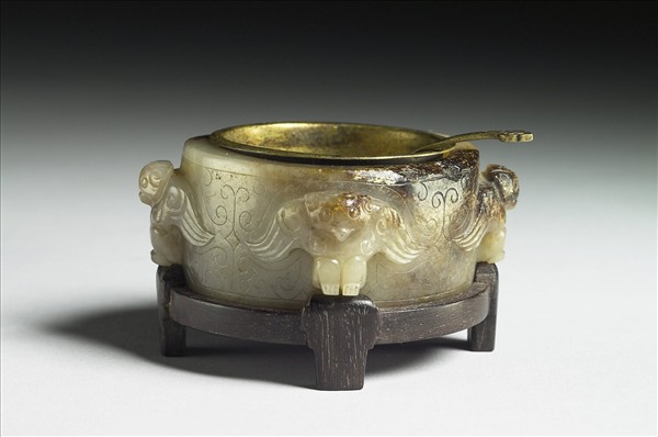 圓筒形,似琮,附木座、膽及匙。器緣四角飾浮雕鴟梟,器面飾陰刻雲紋。
