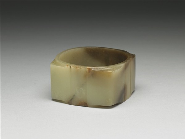 灰青帶暗褐色玉質,溫潤泛光澤。內圓外方琮形,壁薄孔徑較大,射頸極短,射口內、外圈圓整;四面中央刻劃兩道平行線槽,四角微渾圓。內壁拋磨光滑。