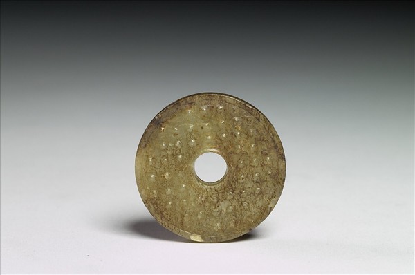 玉質,器身有璺,附木座。器形如環而小,單面飾乳丁紋,乳丁紋間有陰刻線相連。