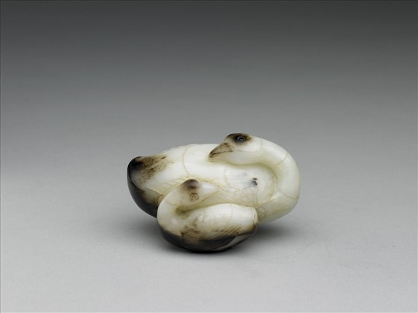 玉質,有璺、黑斑,附木座。全器圓雕,琢子母鵝,作回首臥姿,相互對視,並以陰刻線加強尖喙、羽翅等局部。