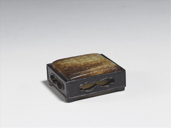 玉質,有深赭斑,附木座。全器呈方形,正面保留西漢原器,背面為明代改製並再加新紋飾。面飾乳丁紋,並以陰線相連,形成雲紋,背飾兩圈方格,內圈填綯紋。器背中央有牛鼻穿。座緣開光。
