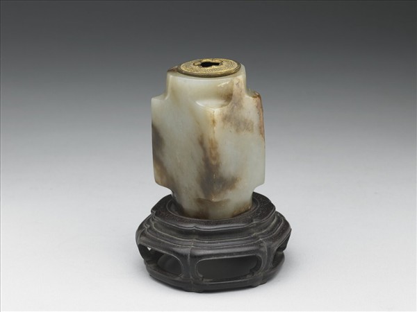 玉質,有赭斑,附木座及銅膽。全器呈筒形,內圓外方,器兩端四角內修為圓形。