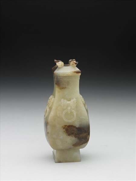 玉質,有赭斑,器身有璺,附木座。仿銅方壼之造形,附鈕蓋、盤口微侈、斜肩、鼓腹、圈足。腹四面浮雕獸首銜環,足飾弦紋。木座底刻「乙」字。