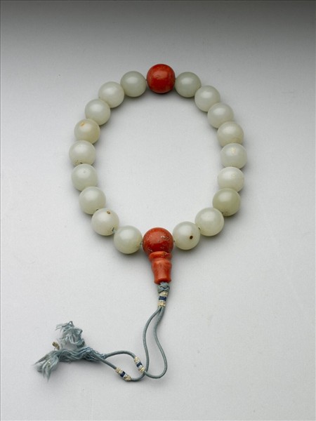 白玉手串,包括:18顆白玉珠、2顆紅珊瑚珠、1顆紅珊瑚佛頭塔,另附木盒。