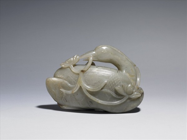 灰玉,有璺。全器圓雕,琢一鴛鴦臥蓮葉上,回首銜一荷枝,並以陰刻線加強羽翅、蓮葉等局部。