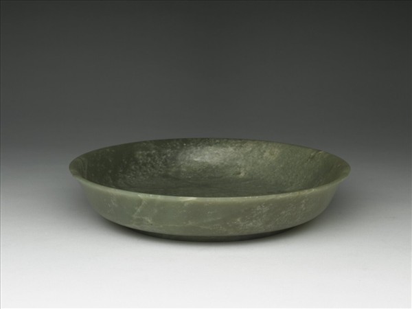 碧玉,有璺、白色斑紋。侈口、淺腹、平底、淺圈足。外底琢「大清乾隆年製」六字篆款。