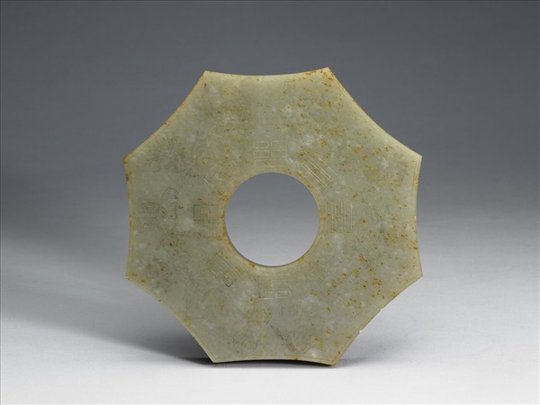 青玉,器形如璧,附八方座。外廓作八角形,中孔正圓。全器以陰刻線表現,一面琢八卦、十二屬相、十二章;一面刻廿八宿、天干等。