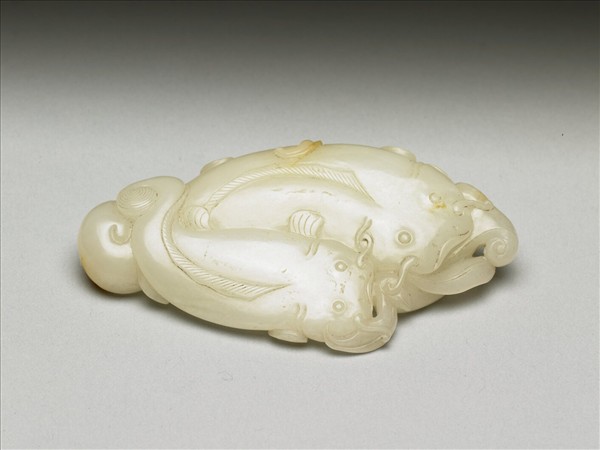 玉質,白色,尾部背面帶黃赭斑。器雕作兩鯰魚並列,魚尾相交,兩魚一大一小,或為子母魚。雙鯰魚的造型,取「鯰」之諧音「年」,而有「年年有餘」和「年年如意」等吉祥寓意。此器於清宮被收納在一竹雕的瓜形盒中。