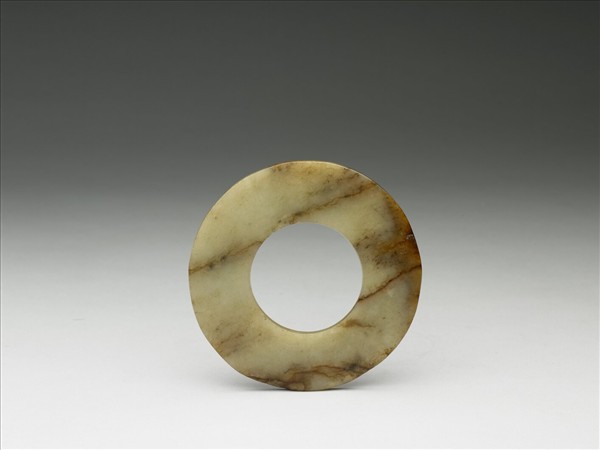 青白玉,局部赭色。頗多裂紋,裂紋處亦沁成赭色。邊緣有缺傷。中孔的尺寸已可戴於成人手腕上。