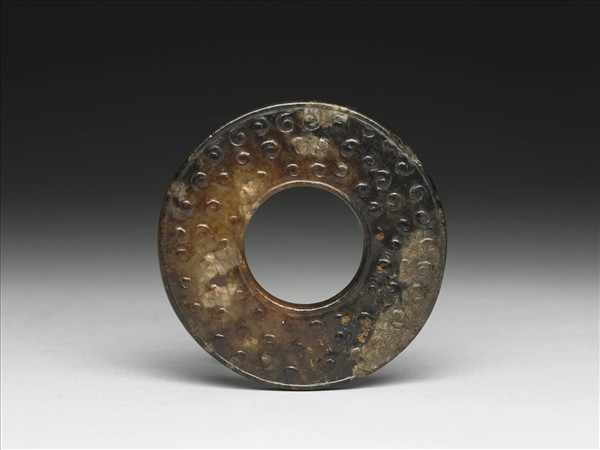 玉質,原為青白色,一面甚被染成褐至黑色,有白綹。系璧,深色的一面內外廓線中間去地浮雕穀紋 ,榖粒大小不一致。另面光素無紋。