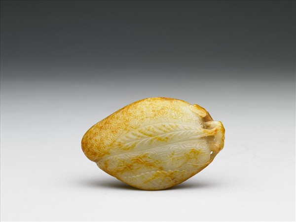 全器琢成荔枝,附枝葉,應用玉皮巧雕。附木座、錦袱。