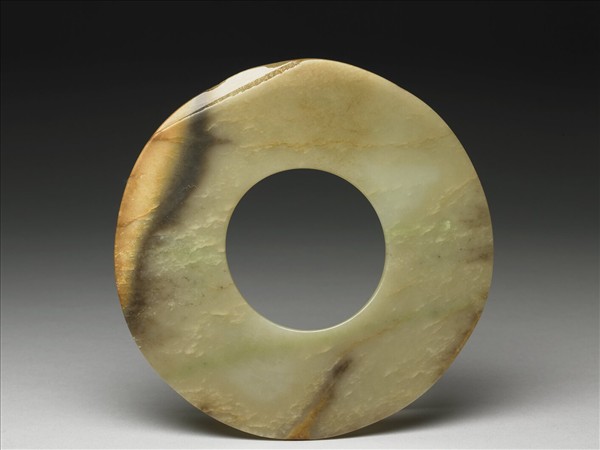 灰青帶黃玉質,玉質中出現兩條綠色帶,一端邊緣出現糖包白料的規律性變化,溫潤泛光澤。圓璧形工整,中孔較大,一面的一端切一斜面。