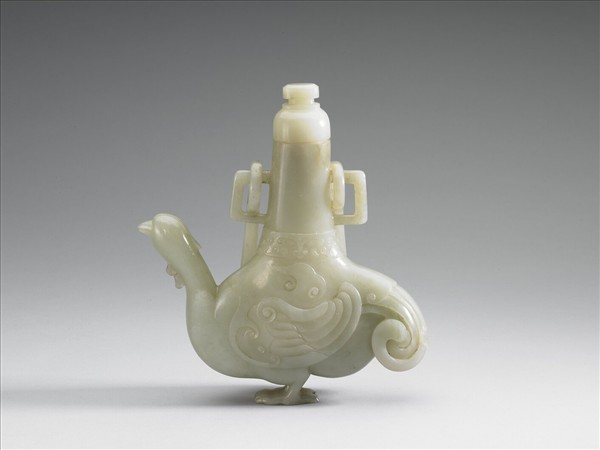 青玉,玉色泛白。全器作扁橢圓形,附蓋,長頸,以兩耳與ㄇ形提樑相連接,器腹為鳥形,前後有鳥首與羽尾向器外凸出,腹下接鳥足。頸部下方浮雕有獸面紋,腹部則飾鳥羽。