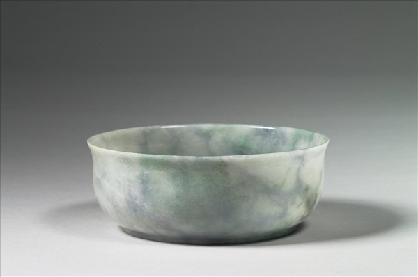 翠玉,有白綹,全器佈滿大片灰斑綠斑。侈口、弧形壁、璧形寬圈足。