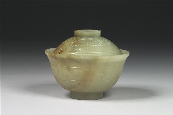 白玉,玉色泛黃,有赭斑。碗蓋為圈形鈕,侈口、弧形壁,有圈足。蓋鈕外側及圈足外一周有重瓣紋,腹壁飾以卷雲構成之獸面紋。附黃籤兩張:「後字八百四十二號」;「丁字第二百廿號」。