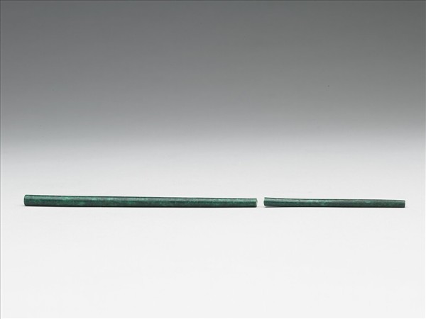 碧玉,玉色墨綠,內有白綹。全器呈圓柱體,無紋。此件斷損。