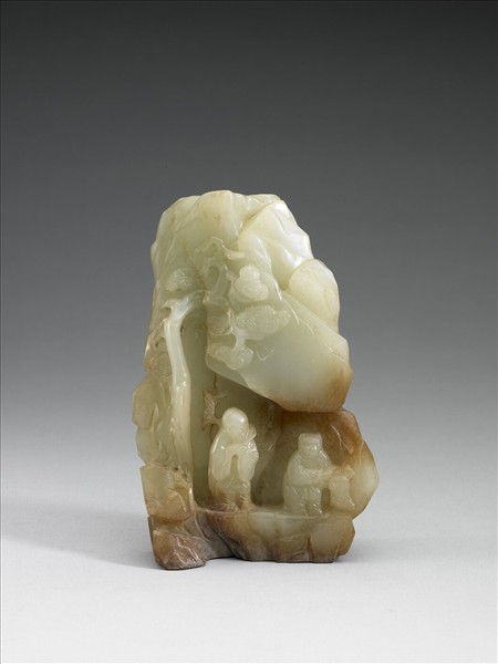 青玉,下半部有大片赭斑。山子正面雕松下老者與童子,背面則有鶴立於松樹下。