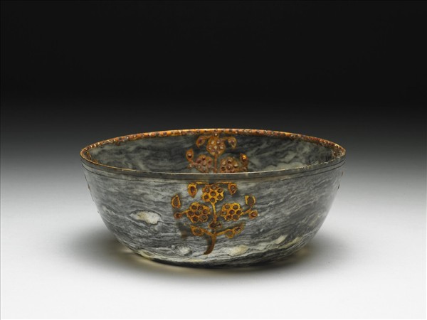 玉質,黑色與白色相間。碗,直口,斂腹,矮足。口沿外下方陰刻兩道弦紋,外壁以泥金和紅玻璃嵌飾花葉紋,平均分布四株;口沿內嵌泥金與紅玻璃一週,內壁亦嵌飾泥金和紅玻璃組合成的花葉紋四株。足底陰刻弦紋兩環。