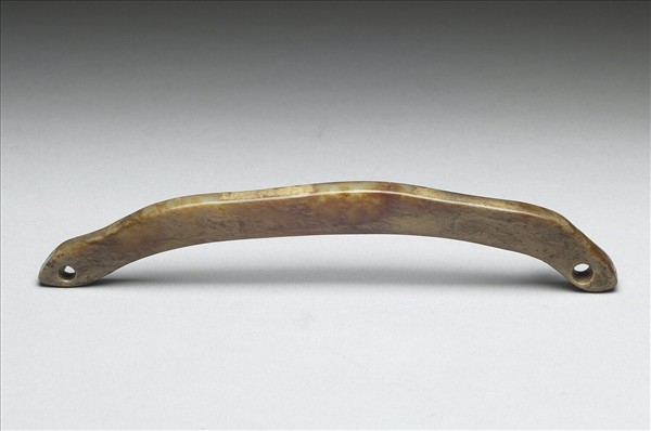 這件雙龍首璜全器較長,器身中段呈波浪起伏,二端在龍口的位置鑽鑿圓孔,再以斷續細陰線刻畫輕淺的龍眼與似長眉般的飄鬣。可能於晚明至清初時被沁染成褐色。