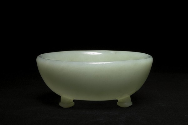 青玉。圓形口,口內斂,深壁弧形,下有三短足,造型圓潤。洗,作盛水之用,為文房用具。全器光素無紋。