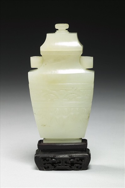 扁方形瓶,帶玉蓋,附木座。頸腹間折肩相連,頸部旁雙耳作圓柱形狀,腹部方直斂下,梯形瓶蓋。腹淺浮雕一圈獸面紋,一圈幾何化蟬紋。