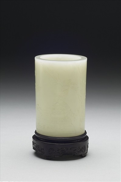 玉質,青色。圓柱形筆筒,上下緣各陰刻弦紋一道,兩道弦紋中間陰線雕琢山石、樹木、房舍、人物等。此玉筆筒在清宮中,配有一鏤雕木座。