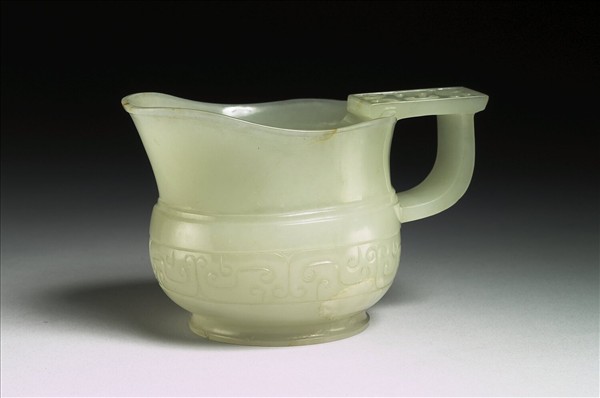 玉質。觥,為古代盛酒器形,單耳供人把持,流用來傾倒液體。器身及耳之上部以雲紋裝飾。