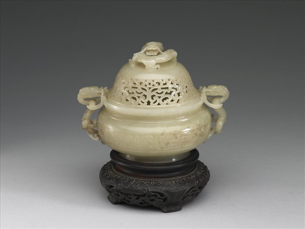 玉質。圓形花薰,屬於香具。蟠龍鈕鏤空器蓋,鏤空的蓋面即為了方便香氣薰出。器腹琢四條夔龍,兩兩相對。兩側為龍形耳。