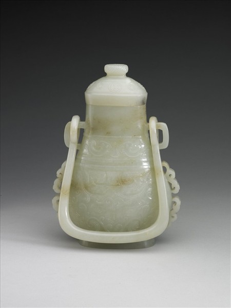玉質。卣是盛酒的酒器,此器仿銅卣的造型,腹飾獸面紋,也是仿青銅的紋飾。雙耳以提梁相連,腹兩側鏤雕雲紋作裝飾。