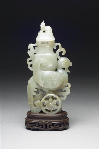 器型仿自當時極具仿古創新之風的銅鳩車,惟器扁,乃因玉料大小之限制。器身為一大鳩,二鳥裝飾於周邊,蓋鈕作蹲獸狀,大鳩腹下有一螭。雕刻工整,拋光亮澤,是典型的乾隆製玉風格。