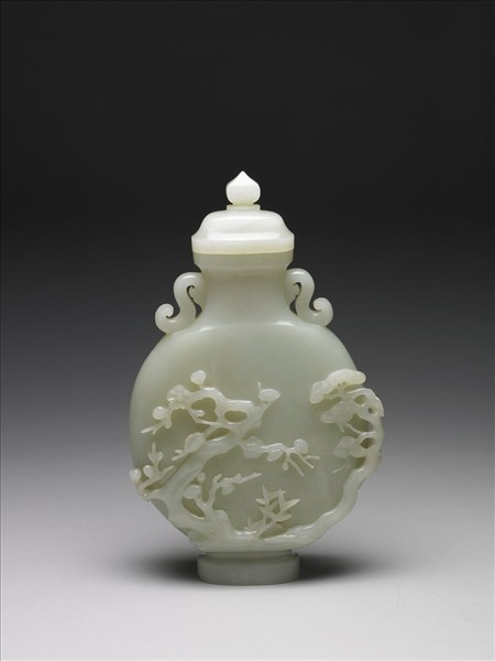 玉質。器作扁圓形,斂口,碩腹,高圈足。肩部有如意耳二,器腹一面浮琢松、竹、梅歲寒三友,另一面浮琢成菊花與蝙蝠。蓋鈕則琢雕為桃實形。圈足內有「乾隆年製」四字隸款。附木座。