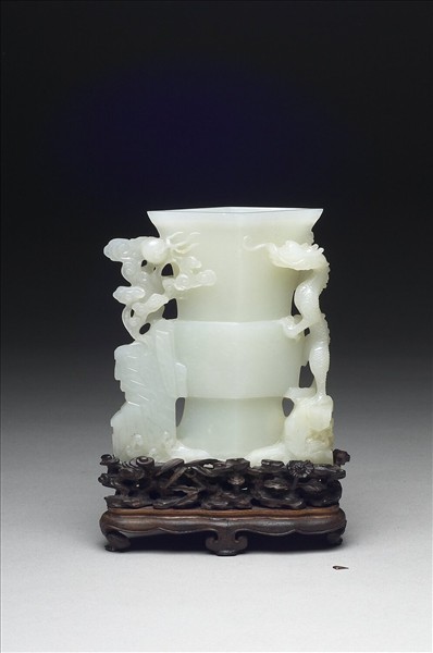 玉質。器形仿古銅尊,侈口,口作菱形。器一側浮琢一龍立於石上,一側浮琢山石,石上有靈芝與祥雲拱珠,器下則琢海浪為底,呈現龍搶珠之場景。器身光素無紋。附木座。