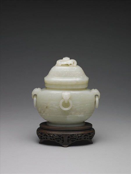玉質。器作橢圓,深壁,斂口,腹微碩,矮圈足,肩有四象耳,均帶活環。口緣琢飾回文,肩琢四夔紋,腹有圖案化獸面紋,圈足則環琢回紋為飾。蓋鈕琢作盤龍,蓋身飾以夔紋,蓋緣亦以回紋飾之。圈足內有「大清乾隆仿古」六字隸款。附木座。