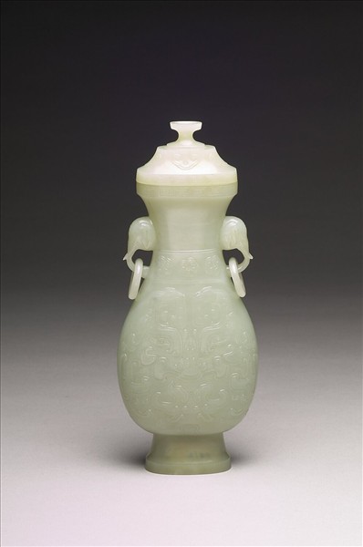 玉質。器身呈扁橢圓形,兩側有象首活環耳。器腹飾獸面紋,頸部飾花朵紋,器蓋有如意紋,口沿處飾回紋。圈足內有「乾隆年製」四字隸款。附木座。
