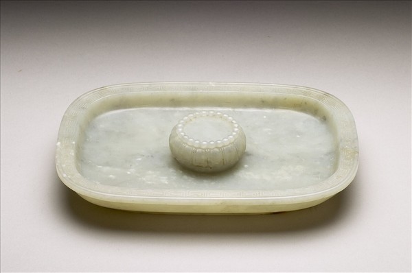 玉質。器作長方形,侈口,淺壁,平底,矮圈足,盤周緣環飾回紋一圈。盤心浮琢一蓮花座以為杯托,座面環雕玉珠一圈。底有「大清乾隆年製」六字篆款。