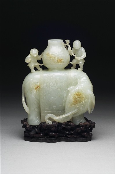 玉質。器身琢作立象狀,上負一壺,壺左壺右各立一嬰,其中一嬰執有梅花一枝,象背亦有一著帽小孩作向上攀爬之狀,三人似正嬉戲。象背披附之座飾,琢有松樹、鶴、鹿等祥瑞物象,象背上瓶前後亦琢有獸面紋。附木座。