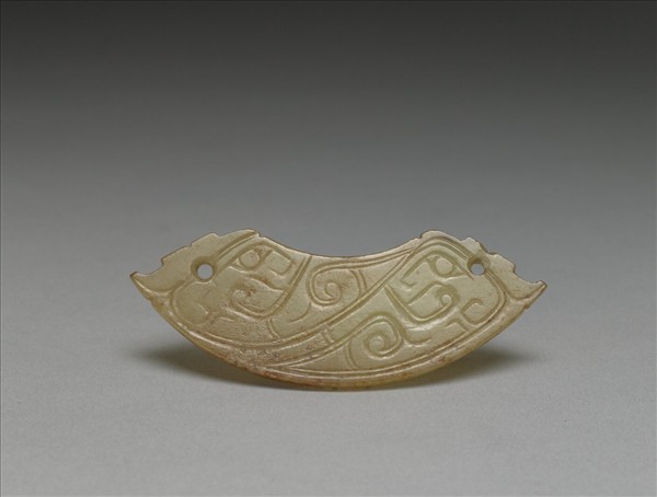 青玉璜。正反面以雙陰線刻出雙龍紋,頭部於兩端,身體向另一側延伸,紋飾隨器形輪廓形成頭大身小的彎三角形。於璜兩端,即龍頭頂部各有一圓穿。