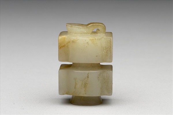玉白色,雜赭斑。片狀方形,中段內凹有穿,上下有小勺與盤。