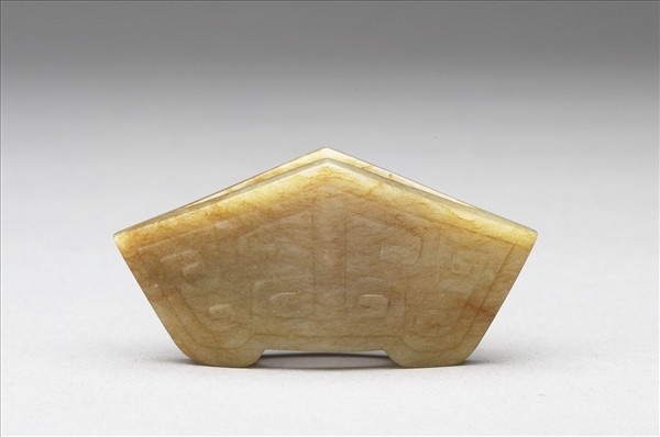 玉質,白泛褐。全器作磬形,中有一穿甚大,面飾雲紋。此形器為漢代的劍鐔是作為劍身與劍柄間隔之用。