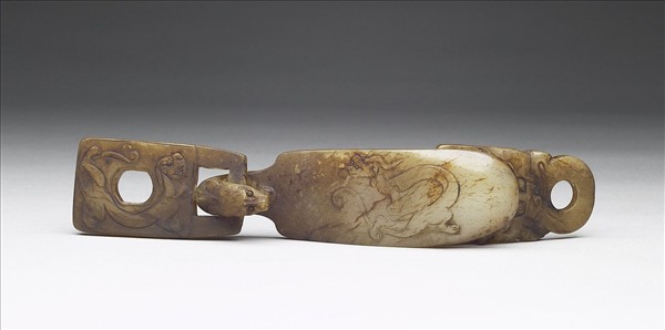 玉質,白色面有赭垢。全器分三節,中間為帶鉤,後方銎連扣環,前獸首連另一個扣環。此器面分飾螭紋或獸面銜環。