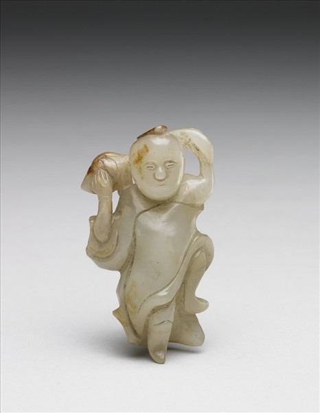 玉質,色灰白,局部雜赭班。童子雙手揚舉一束桃枝,提起左腳,單足著地,表現出馱物行走的動感。