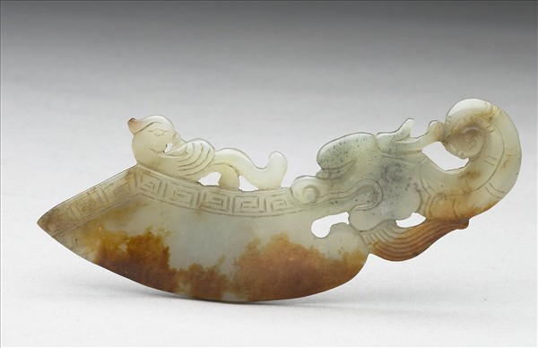 玉質,片狀,色灰白雜黑、褐紅色斑。柄飾卷鼻龍首,刀緣飾回紋,其上廓出一回首立鳳。