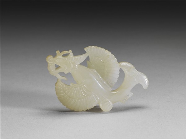 青色閃玉質。器首為龍形,有雙翅,尾作魚形,龍口銜珠。在翅、鰭與尾部共有七個圓穿,可能為佩飾之物。