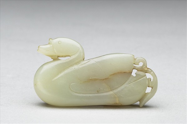 玉質,色灰白,一面器表微傷。全器以臥鴨為造型,尖喙銜水草,身驅肥厚,造型較為呆板。上下有通心穿,穿孔頗大。