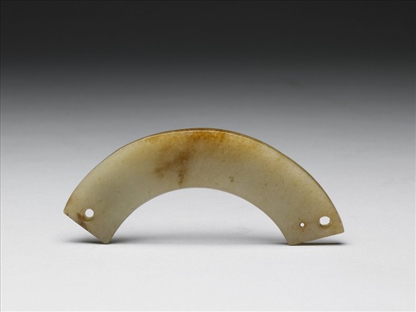 玉質,色灰黃,局部雜赭斑。片狀,呈兩側對稱的條弧形,一端鑽一孔,另一端為雙孔,一大一小,小孔由單面鑽成。全器平素無紋。