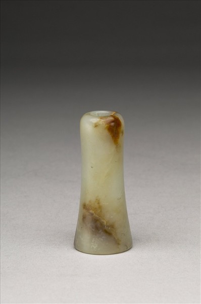 玉質,色白雜赭斑。圓管狀,上小下大,器中段微內縮。器面平素無紋。