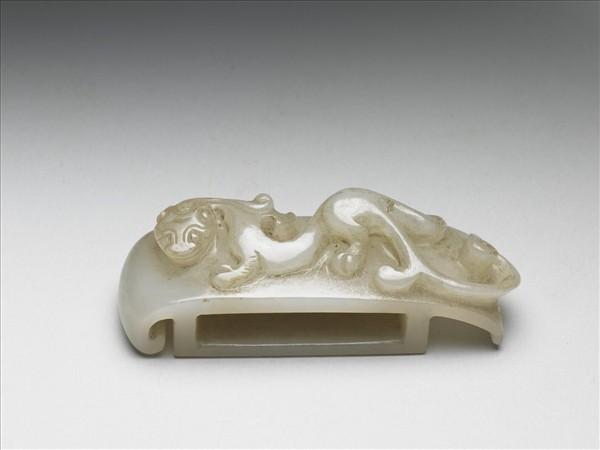 玉質,色灰白。器面飾浮雕螭紋,回首與獸身扭轉呈S形,頗具動感。劍璏是嵌飾於劍鞘上的飾物,同時具有固定革帶的功能。