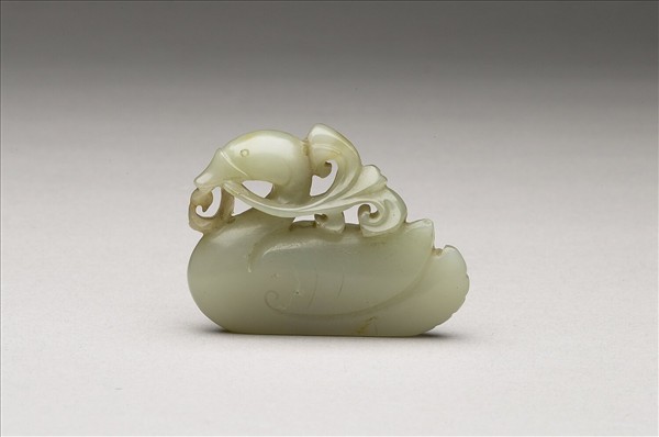 玉質,色灰白泛青。全器以臥鵝為造型,尖喙曲頸,口銜葉枝一束,羽翼豐潤。上下有通心穿。臥鵝造型簡拙,與口銜葉枝圓轉流暢,相映精巧成趣。