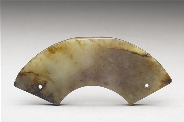灰青帶褐絲斑玉質。呈彎月形,為一環形的三分之一,製作整齊,兩側各鑽一孔,單面鑽。