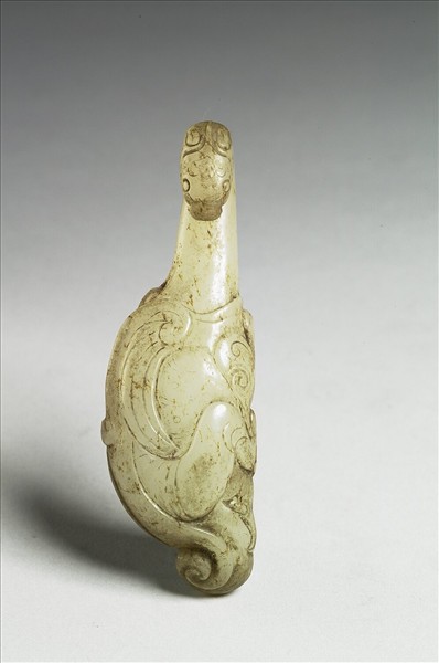 白玉,雜黑赭斑。獸首尖喙,面琢羽翅獸足、尖爪長尾,底有圓柱。